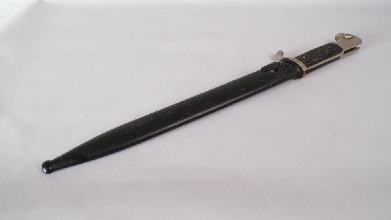 The hilt and bakelite grips shows wear, the scabbard is in a good condition, the blade has seen better days, but most of it's factory polishing is still present.