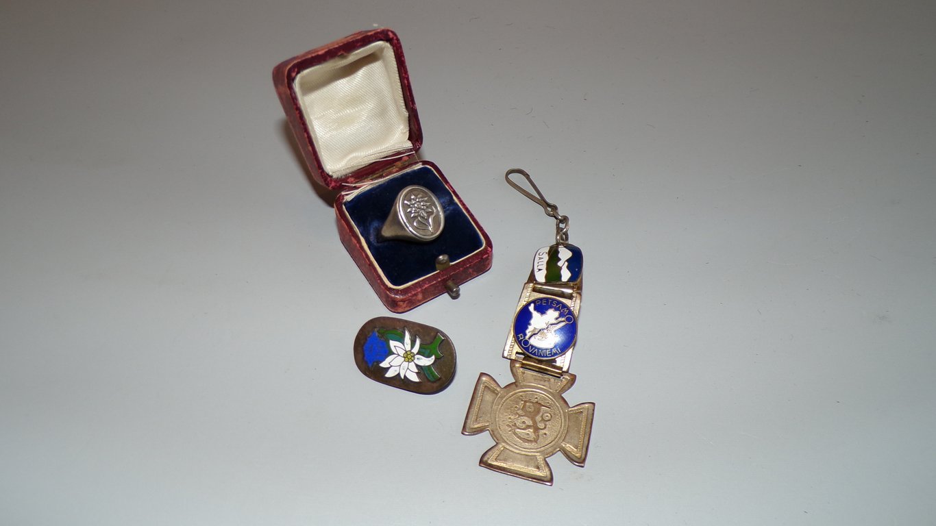 Consists of a watch pendant with two unofficial medals, a mountain hunter division pin and a mountain hunter ring. The watch hanger has two medals attached, the Petsamo-Rovaniemi and the Salla., they are attached with their original screw back, screws are maker marked by two different finish manufacturers (the medals can be removed from the hanger). The Petsamo medal was awarded in remembrance of the 820 km march on the Arctic Ocean Road (Petsamo - Rovaniemi) 25.10. - 2.12.1941. The Salla medal was handed out in remembrance of the battles in the region Salla. The individual stickpin is maker marked by Carl Poellath of Schrobenhausen (also known as RZM M1/103). The ring is made in silver and comes in it's box, it weighs (ring alone) 7 Gram. It is hallmarked with "800" and a edelweiss hallmark. The ring is worn but shows many details.