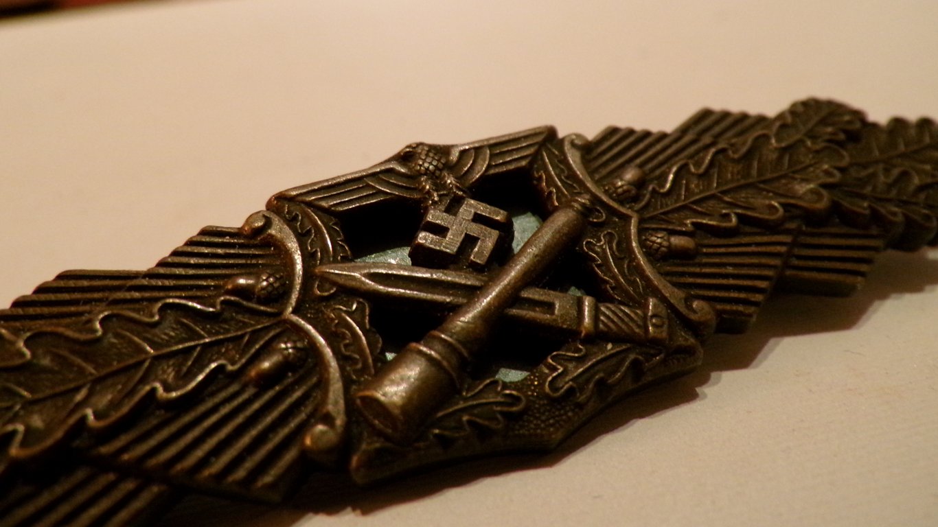 "Nahkampfspange in Bronze" translates to "Bronze Close Combat Clasp". This was a German military decoration during World War II. It was awarded to Wehrmacht soldiers who had participated in close combat for a certain number of days. The bronze version was the lowest class of the decoration and was awarded to infantrymen who had: spent one day in close combat for those previously awarded, or spent 15 days in close combat (if this was their first such award). There were also silver (30 days of close combat) and gold (50 days of close combat) versions.