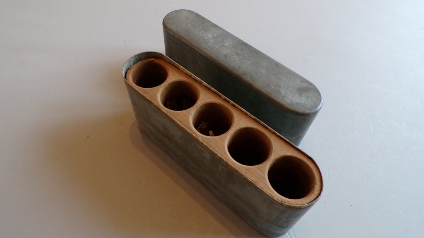 Zinc tin with the wooden interior for the igniters C/98. Good condition and well maker marked "BRC" which stands for Fritz Weber & Co. Metallwaren- und Laternenfabrik from Berlin. Dated 1942.