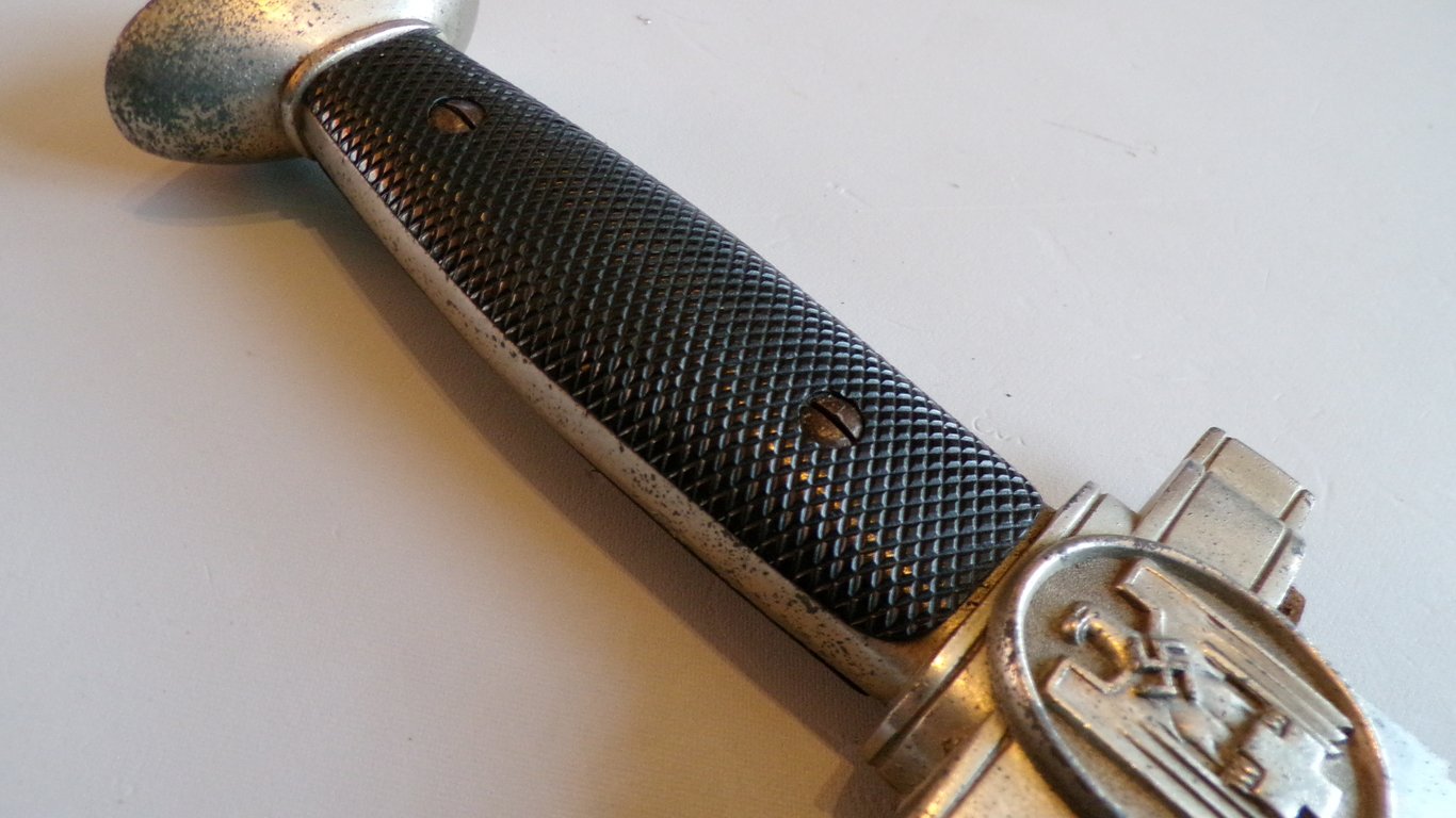 The German WW2 Red Cross (Deutsches Rotes Kreuz, DRK) hewer was a distinctive, multi-purpose edged weapon issued to enlisted personnel as both a dress item and a practical tool for medical tasks such as preparing splints and casts. A separate, more ornate dagger was issued to officers. The tip was intentionally blunt and squared off to comply with the Geneva Conventions, which prohibited medical staff from carrying offensive weapons. The blade featured a single cutting edge and a double row of saw teeth along the spine for practical use in the field. The reverse of the blade is typically stamped with "GES. GESCHUTZT" (Protected by Law) just behind the crossguard. The hilt fittings (crossguard and pommel) were made of a white metal base with a thin nickel plating. The grips were typically black Bakelite secured by two screws, with the obverse (front) grip often having a diamond grooved pattern. The crossguard featured an oval medallion with a German Eagle clutching a Red Cross symbol with a swastika superimposed on its chest. The scabbard was made of magnetic sheet metal, painted black, with nickel-plated top and bottom fittings (chape and locket) secured by small screws. The hewer was carried in a specific black leather frog, which is often missing when the hewer is found today