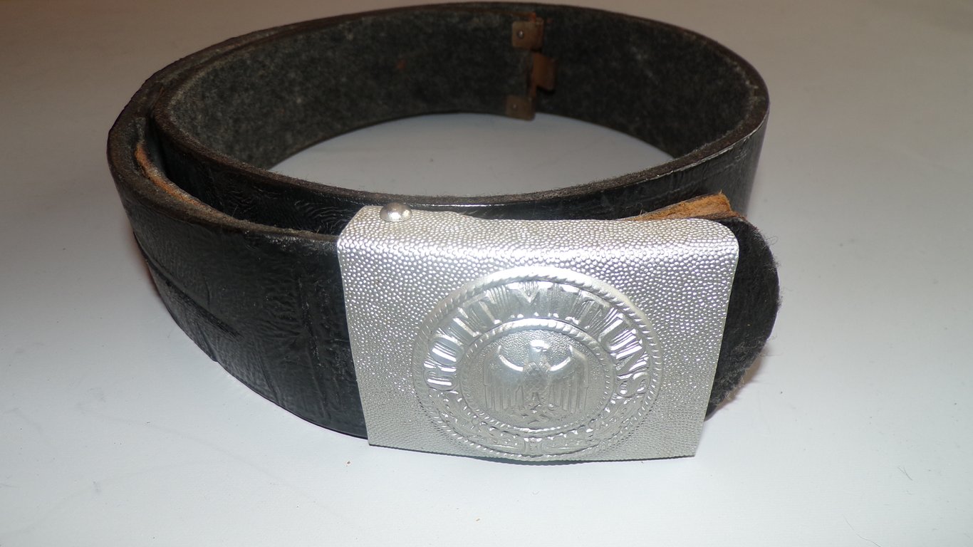These were often an early 2-piece aluminum construction box buckle paired with a lacquered and felt-covered leather belt. They were a private purchase style intended for wear with the dress tunic, though some saw field use. The buckle typically featured the Wehrmacht eagle clutching a swastika within an oak wreath.