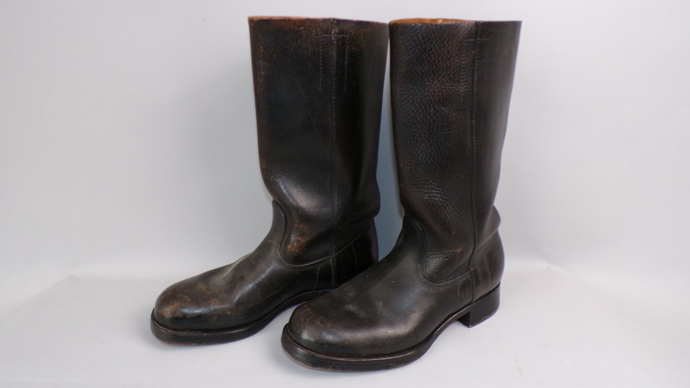 This is a mint pair of marschstiefel, found in Germany. Executed in thick blackened pebbled leather. Soles marked "666" indicating the last 3 digits of the RBNr. "5666" From the company within the district and Reichsgruppe which was the manufacturer 0/0675/5666 Schumacher & Kahl from Frankfurt am Main. A beautifull pair, true survivors!