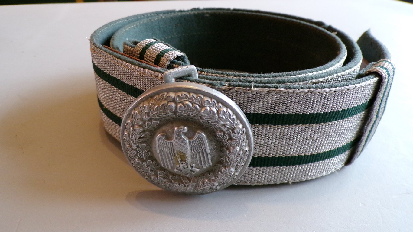 This belt was a formal item of uniform, distinct from the standard field gear. The belt itself was made from a 4.5 cm wide woven fabric, typically silver aluminum threads for most officers (Leutnant to Oberst) with two dark green stripes running through it. It featured a two-piece, die-stamped, circular belt buckle. The design usually included a highly embossed oak-leaf wreath surrounding a central Wehrmacht-style eagle clutching a swastika. Silver finish was used for company and field grade officers (ranks up to Colonel). Gilt (gold) finish was reserved for General officers (Generalmajor up to Generalfeldmarschall). The reverse side of the brocade belt was often lined with a velvet-like or other coarse fabric for comfort and to protect the uniform. The Feldbinde was introduced in July 1937 and was worn for official occasions, including parade dress, formal dress, and service dress when full decorations were ordered. The standard field service belt for daily use was the plain leather or web belt with a standard dual-prong or box buckle.