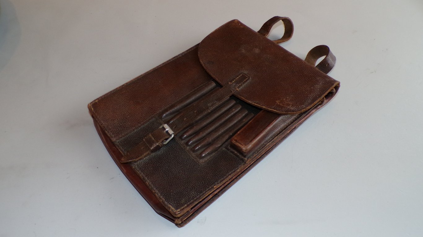 A Luftwaffe Kartentasche is a German term for a military map case used during the World War II era by the Luftwaffe (the German air force). These were typically leather pouches, often in brown or black, designed to protect and carry maps, navigational tools, notebooks, and other related paperwork for officers and pilots in the field.