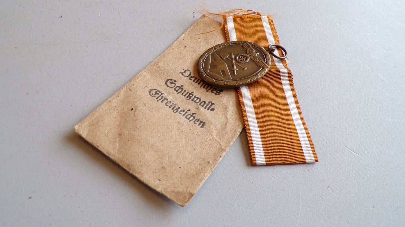 The Deutsches Schutzwall-Ehrenzeichen (German Schutzwall Honor Medal), better known as the Westwall Medal, was a German civilian and military award established during World War II. The medal was instituted by Adolf Hitler on August 2, 1939, to honor personnel involved in the planning, construction, and subsequent strengthening of the German fortifications along the western border, the so-called Westwall (often called the Siegfried Line by the Allies).