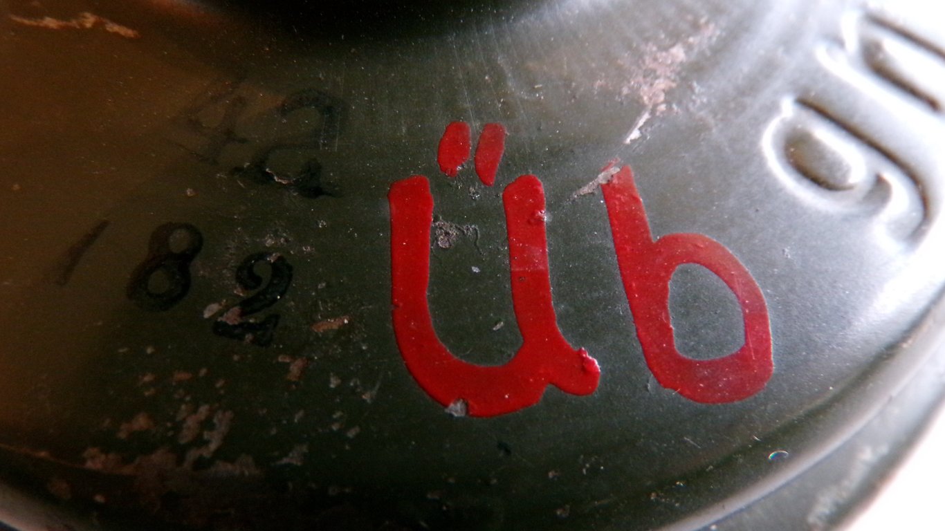 This is a very rare FE41 marked with "Üb" in red paint on top, which stands for Übung (exercise). This was done to prevent them from being accidentally mixed up with active filter units. After many years of collection gas masks, this is the first one I came across with. Rare