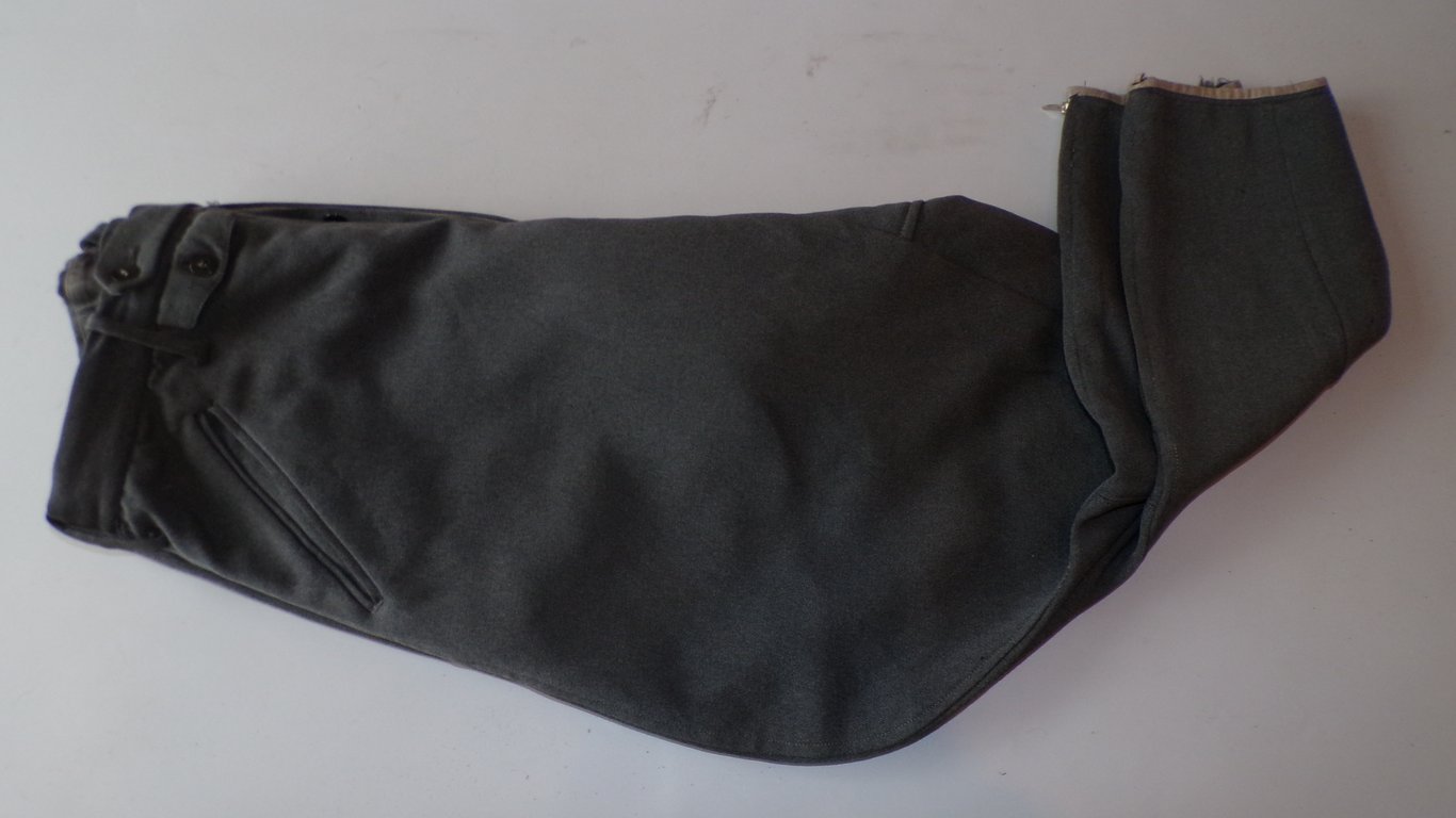 A very nice pair of Luftwaffe breeches executed in stone grey. This model is slightly worn, all buttons, clasps and zippers are present, there are a few tiny moth nips on the end lower legs, but hardy visible. Zippers are in a working condition. Luftwaffe abnahme marked! A very nice pair.