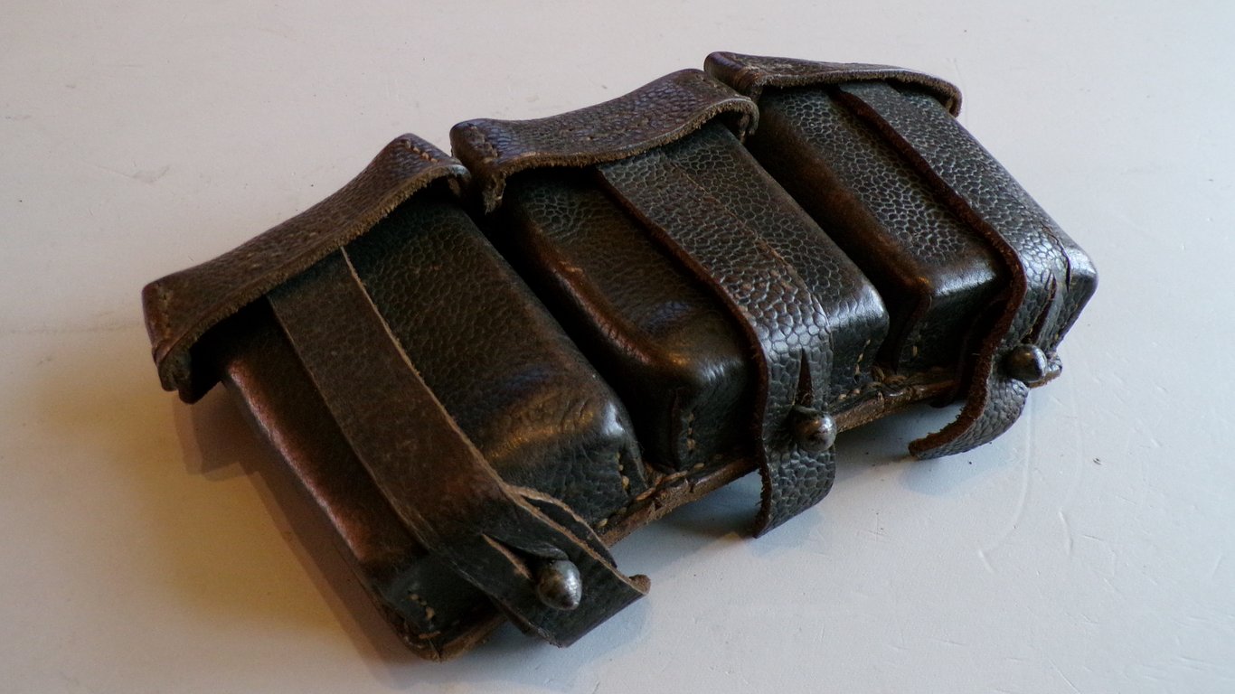 The pouches held the 7.92x57mm Mauser ammunition, which was loaded into the rifle via 5-round "stripper" clips. Each pouch had three main compartments and held a total of 30 rounds (six 5-round clips). Soldiers armed with the K98k rifle were typically issued a pair of pouches, for a total of 60 rounds. They were primarily made of leather. Early-war pouches were often a natural brown that the soldier was expected to blacken and polish, while later-war production switched to pre-blackened leather.