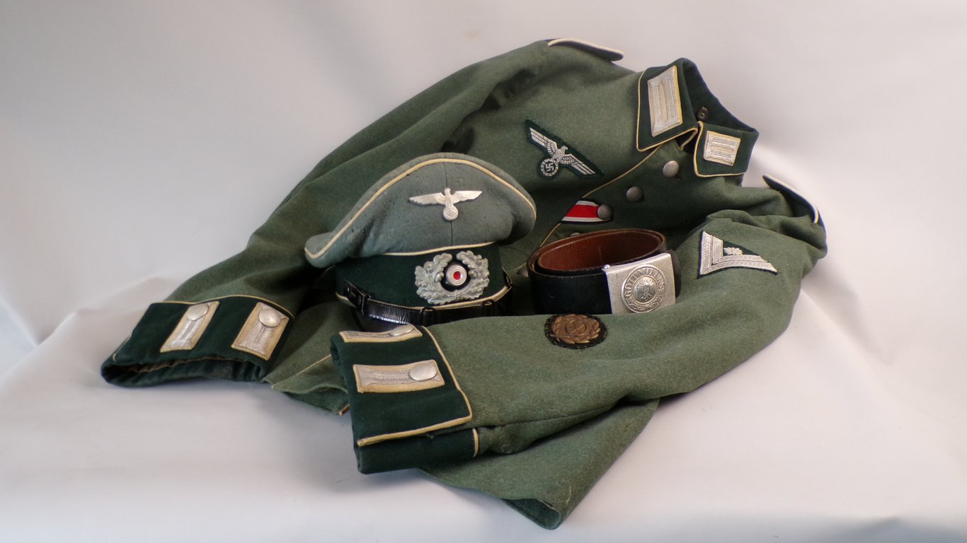This advertisement consists of the Waffenrock, the schirmmutze, and the lacklederkoppel (parade belt) with the kastkopppelschloss (belt buckle) belonging to the same person. It comes from the estate of Oberstabsgefreiten Albert Scheibe, who served in the 260th Infantry Division.