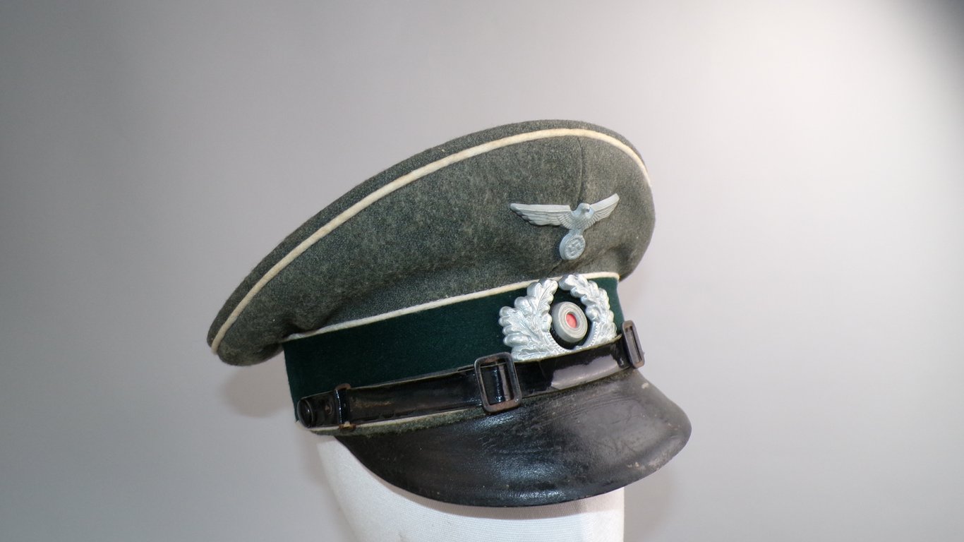 The Schirmmütze was the standard service and dress peaked cap worn by all ranks of the German military (Wehrmacht Heer, Luftwaffe, etc.) during the Nazi era. The distinguishing features of an enlisted man's Schirmmütze included a black leather chinstrap and stamped metal insignia, in contrast to the braided silver or aluminum cords and potentially higher-quality materials used for officer versions. The most obvious differentiator, enlisted men and NCOs wore a black leather chinstrap secured by pebbled buttons. Officers had a braided metallic (silver or aluminum) cord. The cap featured the national eagle-and-swastika emblem (Wehrmachtsadler) above a national cockade (red, white, and black) surrounded by an oak leaf wreath. For enlisted men, these badges were typically stamped aluminum or alloy. Piping (Waffenfarbe): The cap had colored piping along the top edge of the crown and around both the top and bottom edges of the dark green cap band. This color, or Waffenfarbe, indicated the wearer's specific branch of service (e.g., white for infantry, red for artillery, rose-pink for Panzer troops). Issued enlisted caps were typically made of field-grey wool or tricot fabric and often had a softer, "teller form" (dinner plate shape) top. While officers often purchased their caps privately to have a fashionable "saddle form" shape and higher quality doeskin or gabardine cloth, enlisted men could also purchase higher quality caps that resembled officer caps, with the leather chinstrap remaining the key signifier of rank. The Schirmmütze was part of the dress, service, and "walking out" uniform when in garrison. While some officers wore their Schirmmützen in the field, enlisted men typically did not, especially after the early war years, instead using field caps or steel helmets.