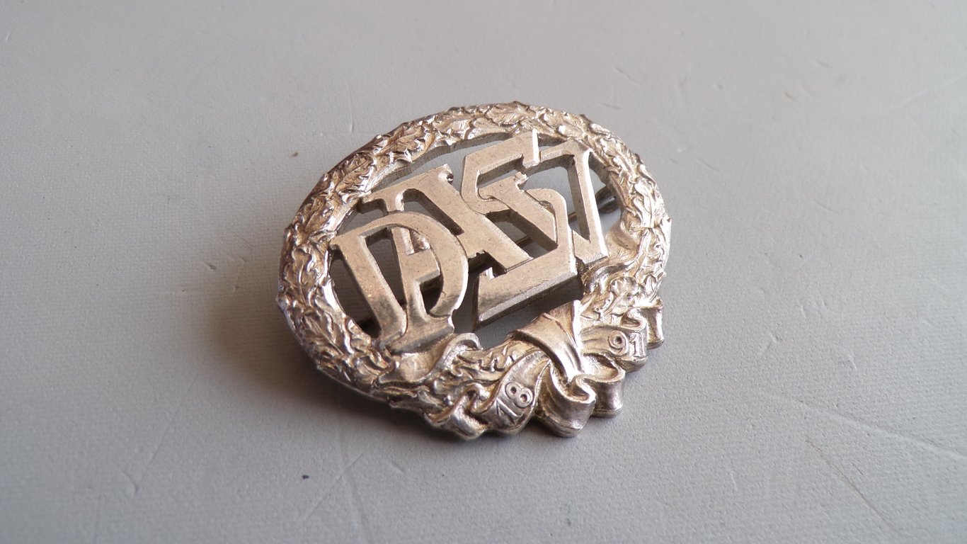 The DASV Sportabzeichen in Silver was a sports performance badge issued by the Deutscher Athletiksportverband (German Athletic Sports Association). It was awarded by the DASV, which focused on "heavy athletics" (Schwerathletik), including disciplines like wrestling and weightlifting. The silver grade of this specific association's badge is considered rare among collectors of historical sports memorabilia. While similar in name, it is distinct from the more common Deutsches Sportabzeichen (German Sports Badge) awarded by the DOSB, or the historical DRL/DRA sports badges.
