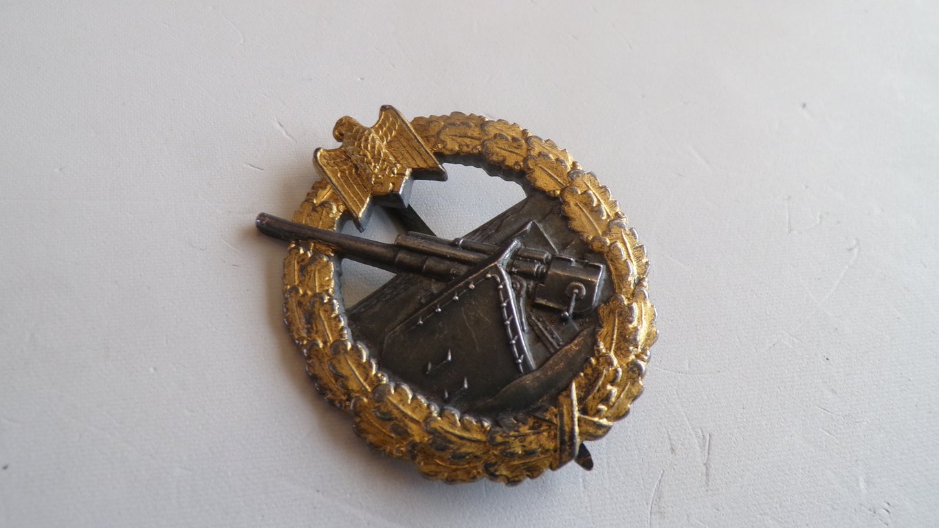 Design: A gilded oak leaf wreath with an eagle and swastika at the top. In the center is a dark gray/silver heavy coastal gun, facing upper left. It was designed by Otto Placzek of Berlin.