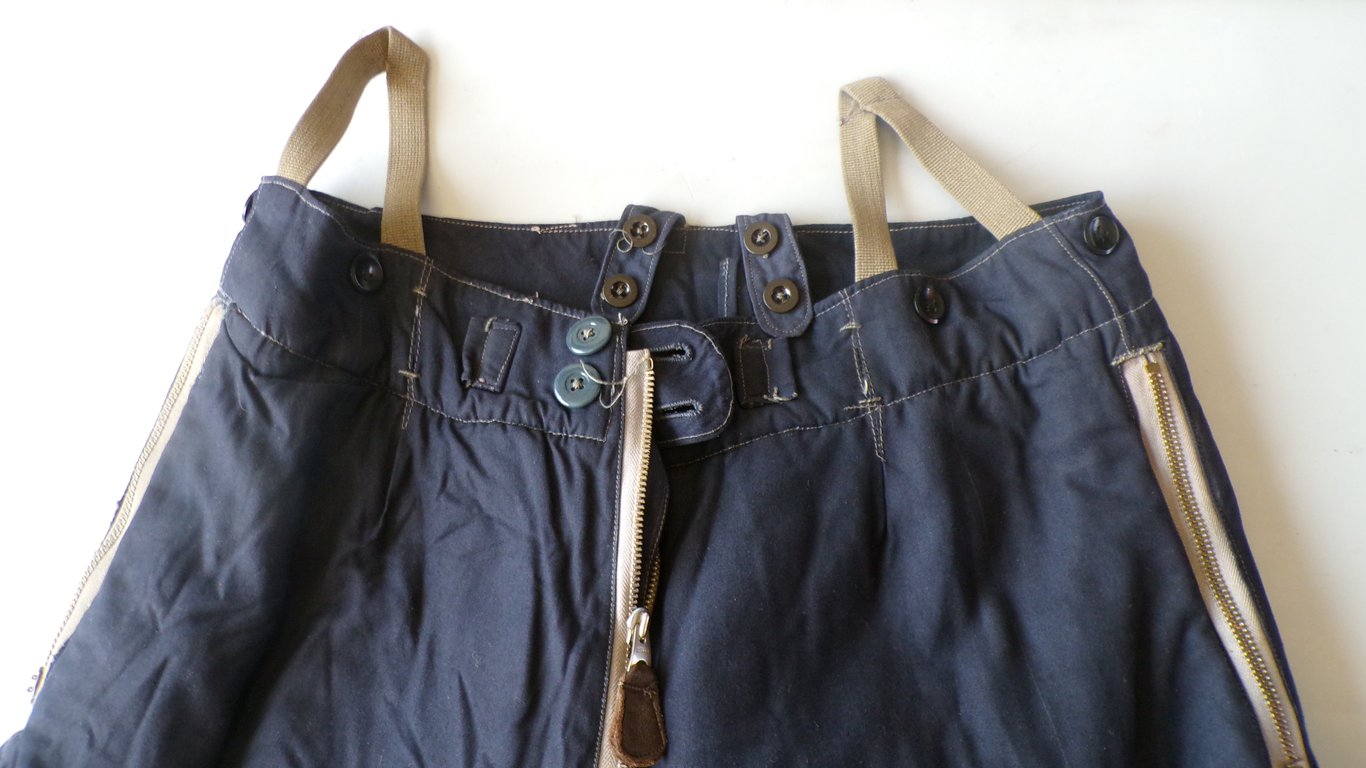 Materials: The trousers were produced in various materials depending on the climate and time of war, including: Winter versions: Made of blue-grey cotton or leather and fully lined with fur or sheepskin for warmth. Some winter models were also electrically heated, with elements that connected directly to the aircraft's power supply.
