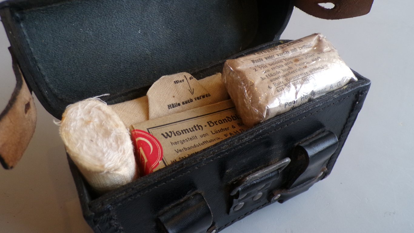 These first aid kits, made of pressed cardboard and leather, come from a depot in Babelsberg, Germany. They were never used, but certainly not military-related during World War II. They do contain some interesting WWII items: some loose bandages on rolls, ointment from 1941, a D.R.G.M. bandage from 1941, a Mullbinde from 1943, a Paul Hofmann bandage from 1943, and burn bandages in the cardboard box.