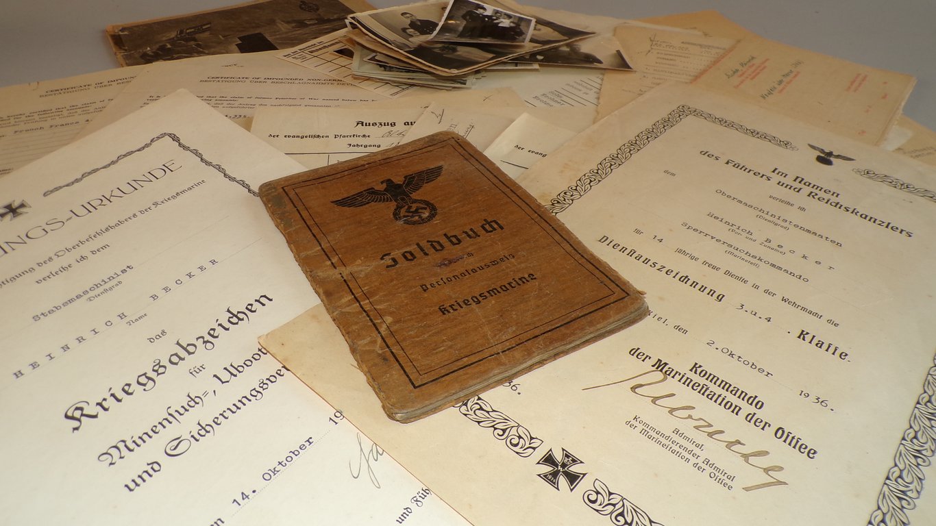 The certificates were signed by Admiral (General Admiral) Conrad Albrecht and Knight's Cross winner Konteradmiral Hans Stohwasser. Heinrich served aboard the battleships Hannover and Elsass, and later on the minesweeper M81 of the 3rd Sperrbrecher Flotilla, who was deployed before and during the 1944 landings on the French and Belgian coasts.
