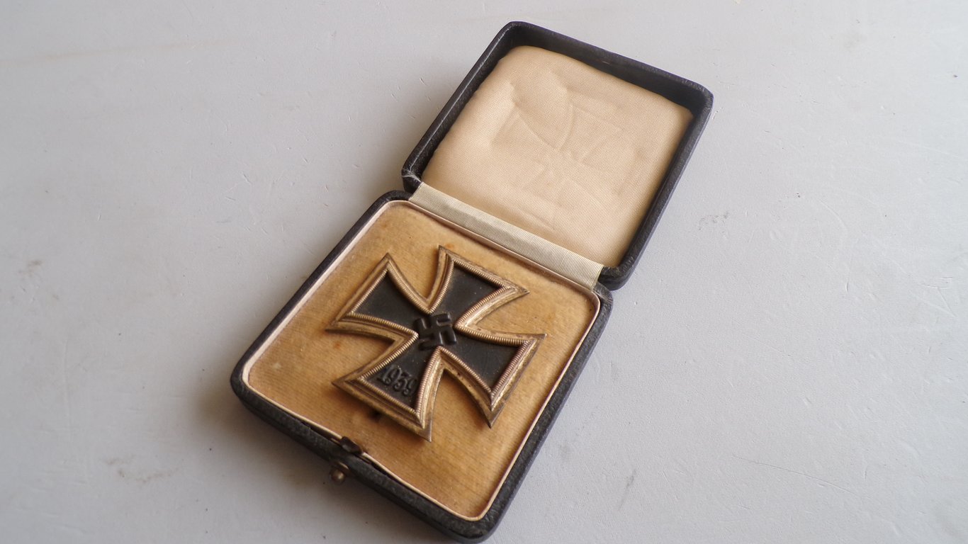The Iron Cross First Class (Eisernes Kreuz 1. Klasse) was a prestigious military decoration in the Kingdom of Prussia and later the German Empire and Nazi Germany, awarded for repeated acts of bravery or exceptional military achievement in a combat environment. It was a progressive award; a soldier generally had to have already earned the Iron Cross Second Class before being eligible for the First Class. It was given for multiple acts of valor or significant meritorious service. The decoration is a cross pattée with a black iron core and a silver (or silver-plated) frame. The specific design varied by the era it was instituted (e.g., 1870, 1914, 1939), featuring the year of institution on the bottom arm. The World War II version included a swastika in the center. Unlike the Second Class, which was worn suspended from a ribbon, the First Class was a pin-on medal worn centered on the left breast pocket of the uniform tunic. It did not have a ribbon. The Iron Cross was notable because it was awarded without regard to rank, being open to all military personnel from private to general officer, although higher classes were less common among lower ranks.