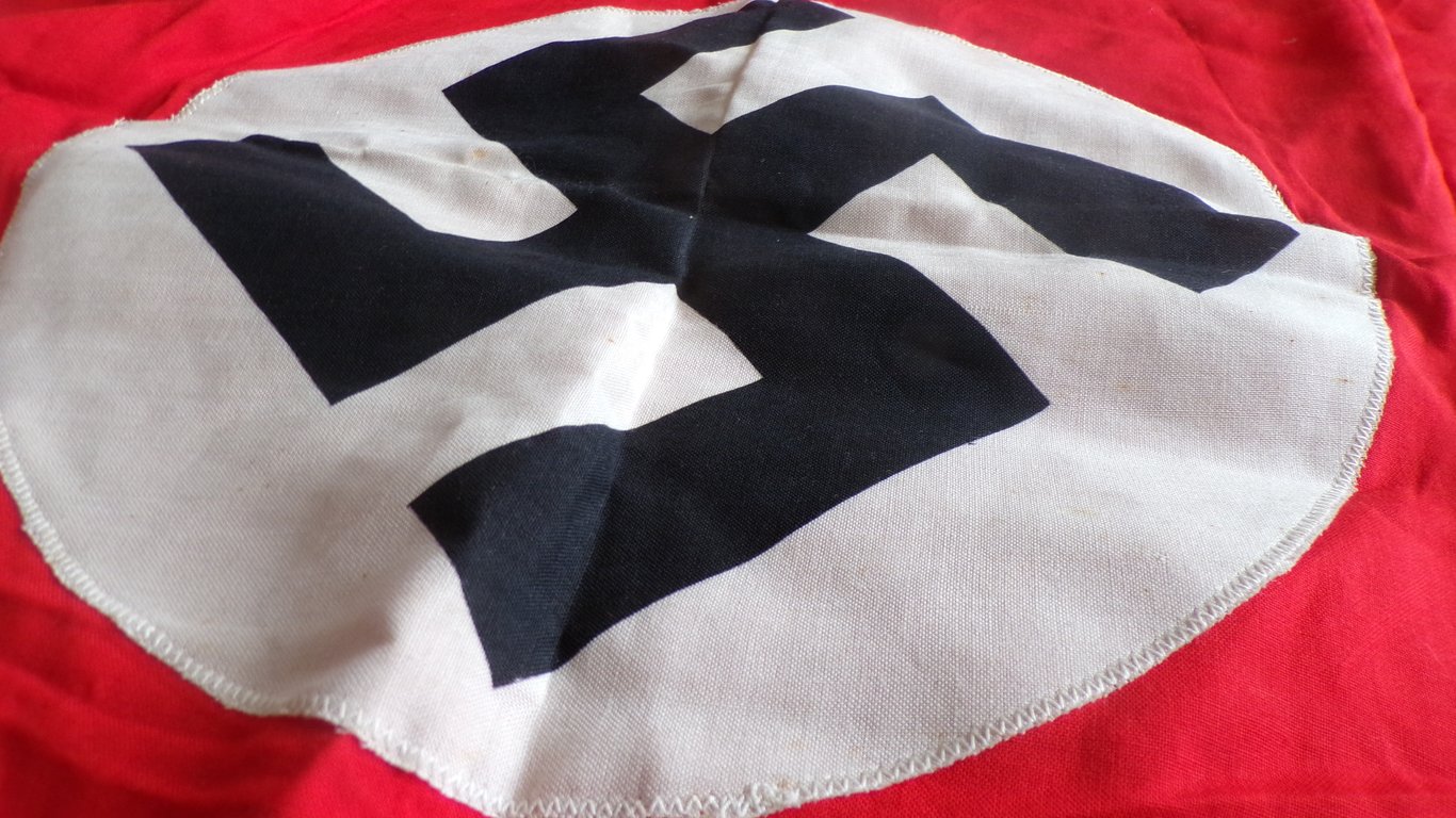 An original and fresh so-called "house flag" for party supporters. This flag was hung from windows by citizens or hung on a flagpole during special occasions or holidays. It's a multi-purpose construction, so the white disc is sewn onto the red cloth. Beautiful, fresh colors without damage. A nice flag in a good size: 73 x 52 CM