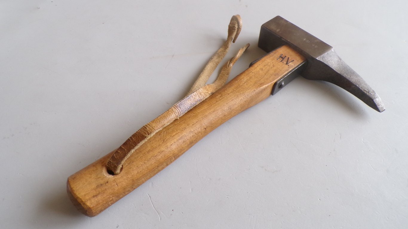 A "Gebirgsjäger hammer" from World War II was a climbing hammer, also called a piton hammer, used by German mountain troops (Gebirgsjäger). This hammer was essential for mountaineering and rock climbing and was used to hammer pegs into rocks for clinging or rappelling. They often had a special shape, such as a long handle and a pointed head, and were produced by manufacturers such as Stubai. Used for climbing and scrambling in mountainous terrain, such as securing ropes and creating anchor points.
