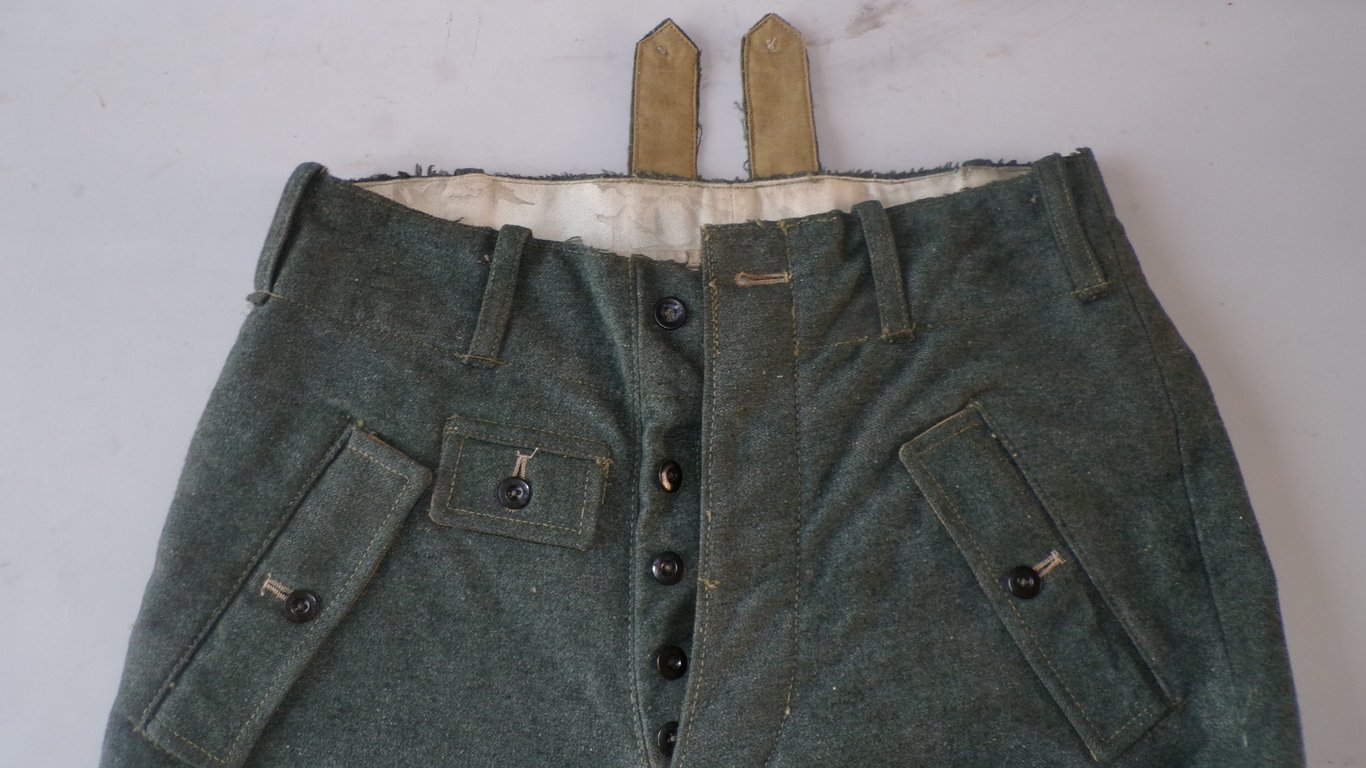 Late-war M44 trousers made of coarse fabric, in worn but very good to near mint condition. All buttons are still originally attached and present. Well marked with size and RbNr. Very rare trousers in excellent condition.