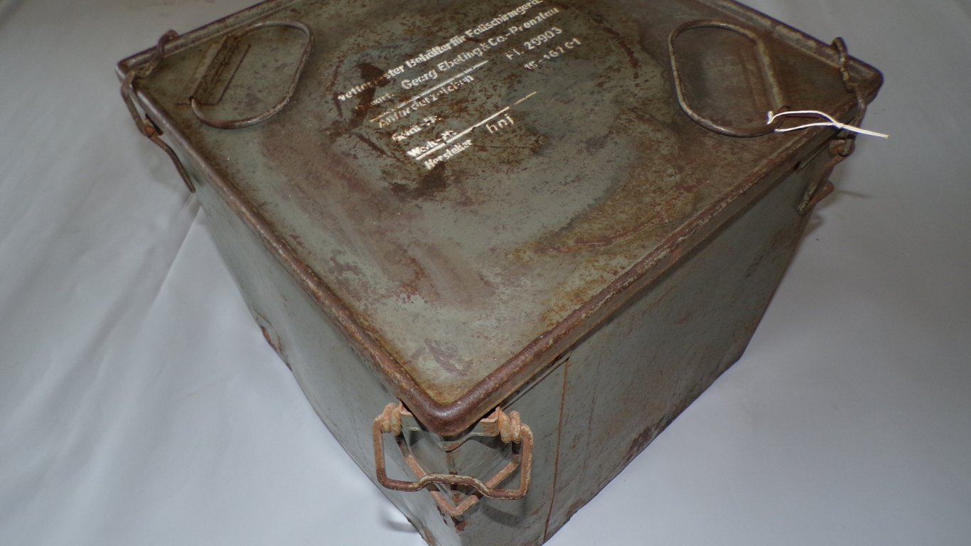 This is a weatherproof crate used to store a parachute for a drop container, not a personal parachute. The drop containers were dropped over an area where the paratroopers had landed. These drop containers could contain various supplies such as weapons, ammunition, rations, and the like. This one is the rare type 29903, a relatively small model with a beautiful apple green color and very clearly legible text. It measures 35 x 37 x 38 cm, so it's almost square. A rare example!