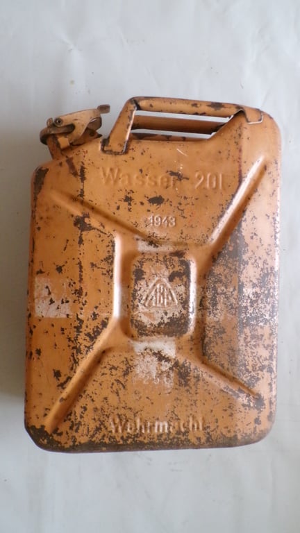 A jerrycan intended for water transport and marked as such. This one is a beautiful (ochre) sand color, most of which is still present. The remains of the white cross are still clearly visible, clearly indicating that this was for water and not fuel! A beautiful example from 1943.