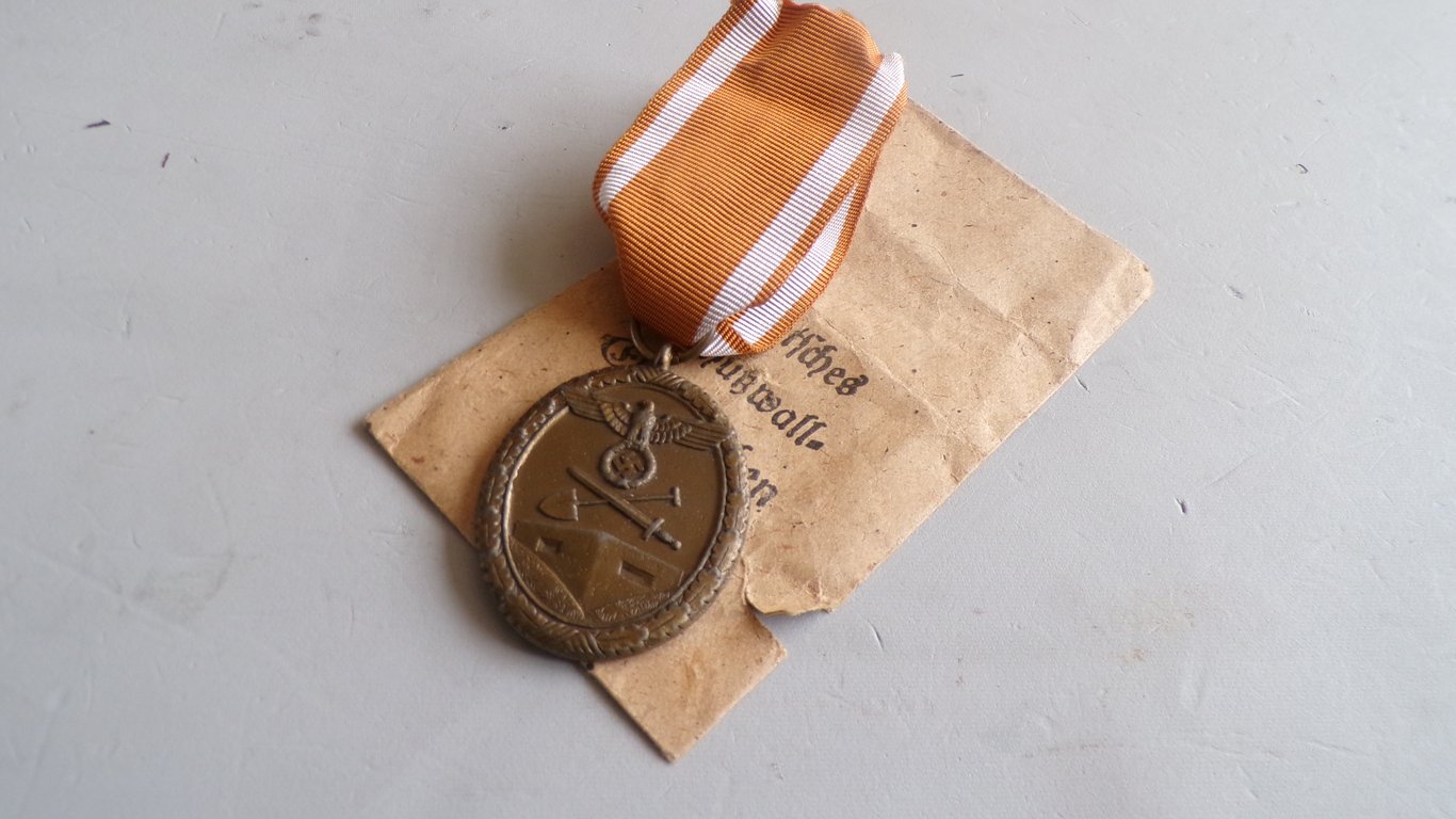 Introduced: August 2, 1939. Award criteria (first version): For military and civilian personnel who assisted in the design, construction, or service at the fortifications between June 15, 1938, and March 31, 1939. This was later extended to Wehrmacht soldiers who had served for at least ten weeks. Number awarded: Approximately 622,064 medals were awarded by January 31, 1941. After the Allied invasion in 1944, the medal was reinstated for those who participated in repairing and strengthening the defenses. This later version was often called the "Defense Wall Honor Award" to distinguish it from the original from 1939. The medal is oval-shaped and made of bronze (later versions were galvanized metal). The obverse depicts a pillbox, a crossed shovel and sword, and the German eagle. The reverse bears the inscription "Für Arbeit zum Schutze Deutschlands" (For Work in Defense of Germany). The ribbon is gold-brown with a white stripe on either side. The medal is a historical artifact related to Nazi Germany's military history and the country's defense efforts.