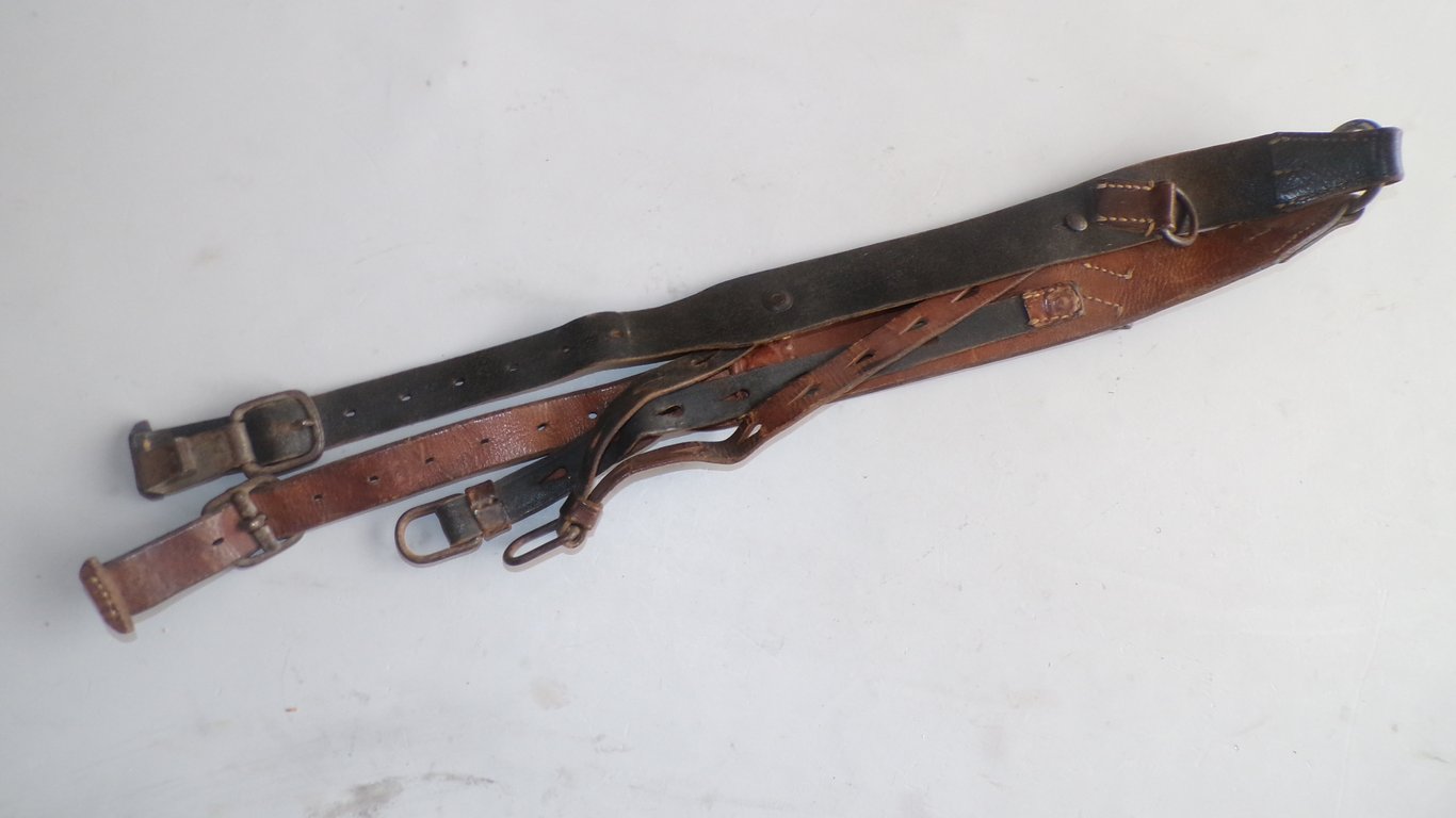 A very nice but incomplete set of Y-straps (actually they are V-riemen now). Production mid-war period. I cannot make out a maker name. Both straps named to a soldier "L. Kraft".
