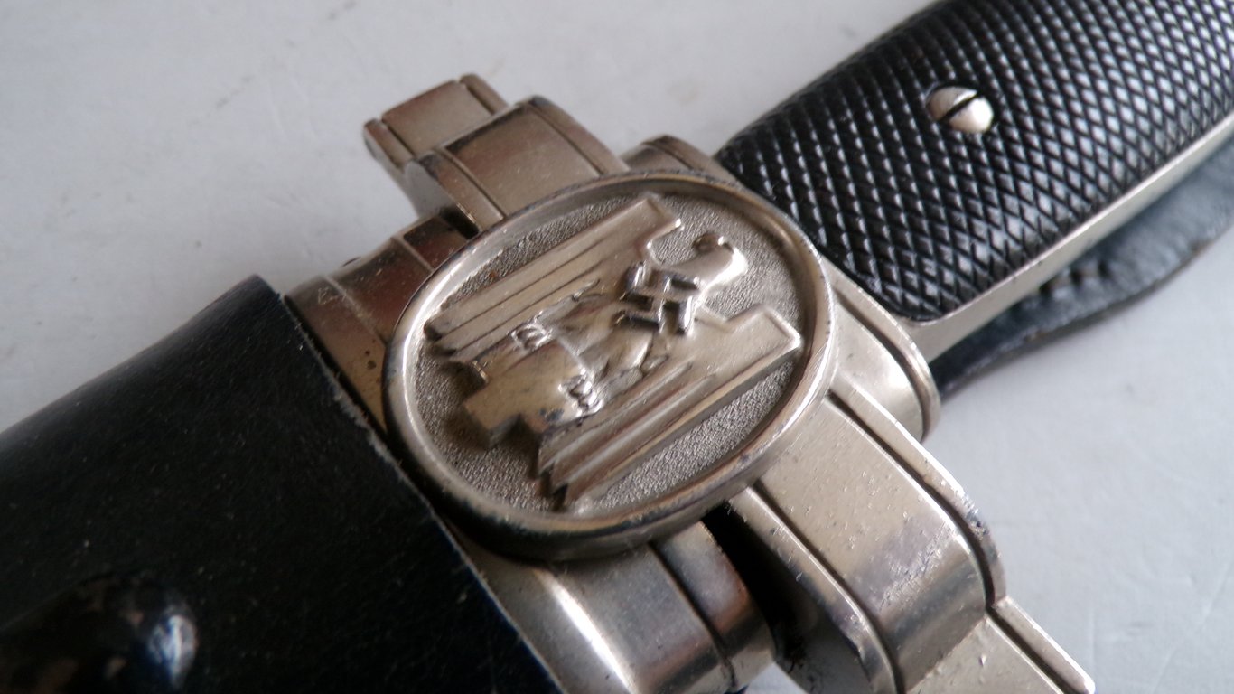 The German WW2 Red Cross (Deutsches Rotes Kreuz, DRK) hewer was a distinctive, multi-purpose edged weapon issued to enlisted personnel as both a dress item and a practical tool for medical tasks such as preparing splints and casts. A separate, more ornate dagger was issued to officers. The tip was intentionally blunt and squared off to comply with the Geneva Conventions, which prohibited medical staff from carrying offensive weapons. The blade featured a single cutting edge and a double row of saw teeth along the spine for practical use in the field. The reverse of the blade is typically stamped with "GES. GESCHUTZT" (Protected by Law) just behind the crossguard. The hilt fittings (crossguard and pommel) were made of a white metal base with a thin nickel plating. The grips were typically black Bakelite secured by two screws, with the obverse (front) grip often having a diamond grooved pattern. The crossguard featured an oval medallion with a German Eagle clutching a Red Cross symbol with a swastika superimposed on its chest. The scabbard was made of magnetic sheet metal, painted black, with nickel-plated top and bottom fittings (chape and locket) secured by small screws. The hewer was carried in a specific black leather frog, which is often missing when the hewer is found today
