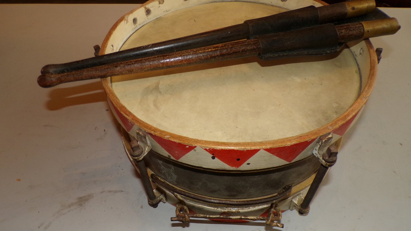 *A Hitler Youth snare drum (German: Marschtrommel, "marching drum") was a specific type of military-style side drum used in fife and drum corps and marching bands by members of the Hitlerjugend (HJ) and its junior branch, the Deutsches Jungvolk (DJ), during the Nazi era in Germany. Function: Drums played a central, rhythmic role in the HJ's paramilitary structure, leading parades, rallies, and ceremonial processions. They were often made with a wood or metal body and featured distinctive, painted red and white or black and white diamond/triangle patterns (known as Rautenmuster) on the wooden or metal rims. Two main types were used: a large Landesknecht (field) drum and a smaller, more common military-style snare drum. *