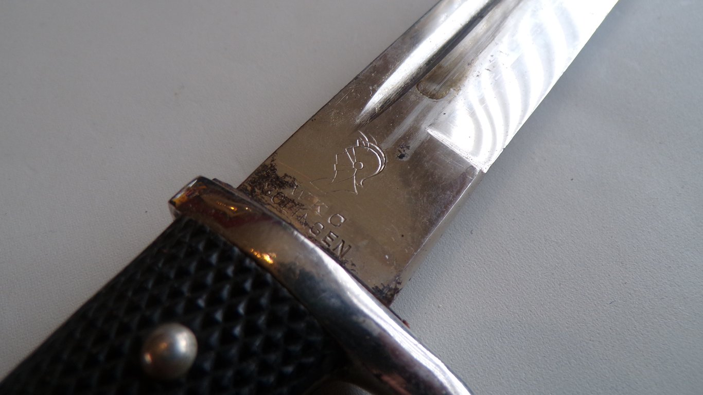 The hilt and bakelite grips are in a very good condition. The scabbard shows normal usage but is in a relative good condition, the blade is very nice, all of it's factory polishing is still present. Well maker marked by the company W.K.C (Weyersberg, Kirschbaum & Cie from Solingen).