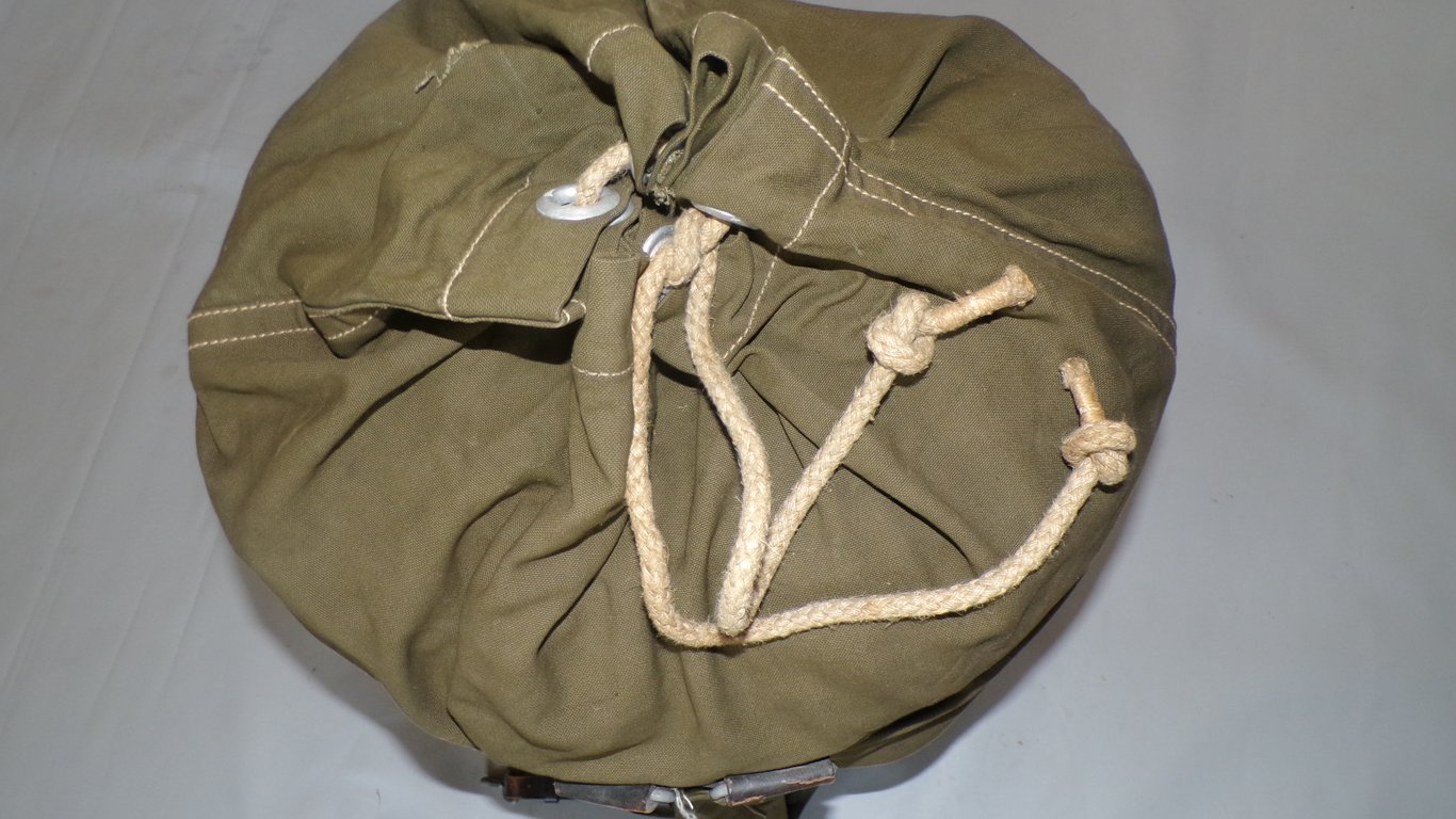 A used Kriegsmarine seesack or kit bag. Complete with its cord, prongs, and carrying straps. It has some wear due to use. It is nicely maker-stamped by Heinrich Ordemberge from Osnabruck and dated 1942.