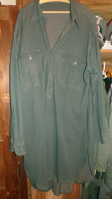 A Heereshemd (Army Shirt) refers to the standard-issue service shirt worn by the Heer (Army) and often the Waffen-SS, serving as a versatile garment designed to be worn either under the Feldbluse (field tunic) or on its own in warmer weather. The shirt featured a half-button, overhead design (pullover style). It typically included two pleated breast pockets, shoulder board buttons and loops for attaching epaulettes (shoulder straps), and buttoned cuffs. While early-war shirts were sometimes white or off-white, the M43 pattern was standardized in shades of green (schilfgrün/reed green) to slate grey or "mouse grey". They were made from durable cotton or cotton-rayon mix materials. These shirts became increasingly popular as the war progressed. By 1943, due to warmer weather or shortages, it became permitted to wear the shirt without the tunic, making the addition of shoulder board buttons necessary for displaying rank.