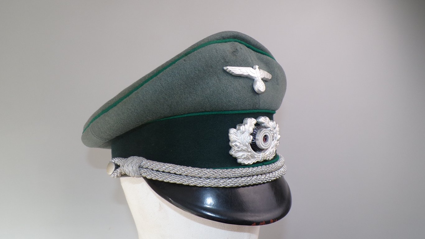 This field-grey doeskin wool visor cap, belonging to a Jäger Officer, is in truly impeccable condition. The piping is executed in a light Green (Hellgrün) color. This piece is made by the company Erel known for it's high end quality visor caps. Executed in the finest quality fabric called doeskin. The term doeskin refers to a high-quality, medium-weight fabric, traditionally made from 100% merino wool, known for its extreme softness, tight weave, and subtle, luxurious sheen. I examined the visor very closely and found literally only a few small spots of moth marks, which thankfully are not all the way through the fabric but are superficial. The "vented" cockade retains 100% of its original silver wash. The eagle has beautiful detailing. The entire piece has a beautiful saddle shape, exactly as you would expect! It has a beautifully finished interior with great maker markings on the diamond but also on the sweathband which is completely intact. The size is 57. In my opinion, this visor is very hard to improve.