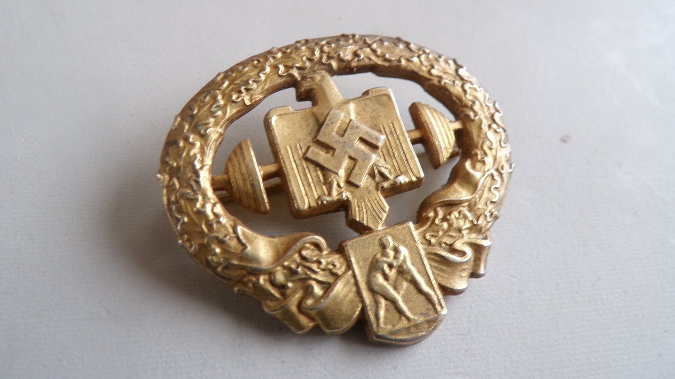 The NSRL Heavy Athletics Badge (or NSRL Performance Badge for Heavy Athletics) in the Gold Degree was an award of the National Socialist Reichsbund for Sports Support, the umbrella organization for sports in Germany between 1938 and 1945. The badge depicts the NSRL eagle with a swastika on its chest, surrounded by an oak leaf wreath. Specific versions for "Heavy Athletics" (Schwerathletik) focused on disciplines such as wrestling, weightlifting, and boxing. The physical award was made of gold-plated zinc or bronze for the metal version (often with a pin closure). There were also fabric versions made of black rayon with gold embroidery, intended for sewing onto sportswear. Manufacturers: Common manufacturers included Hans Gnad (Vienna) and Eugen Schmidhäussler (Pforzheim). The requirements for the gold badge were stricter than for bronze or silver and were often related Direct award was possible for athletes over 40 who completed the required fitness tests within 12 months. For younger athletes (18-32 years old), the gold badge was attainable after maintaining the silver badge for at least seven consecutive years. The badge required successful completion of five tests measuring strength, endurance, and speed (e.g., swimming, jumping, running, and shot put).