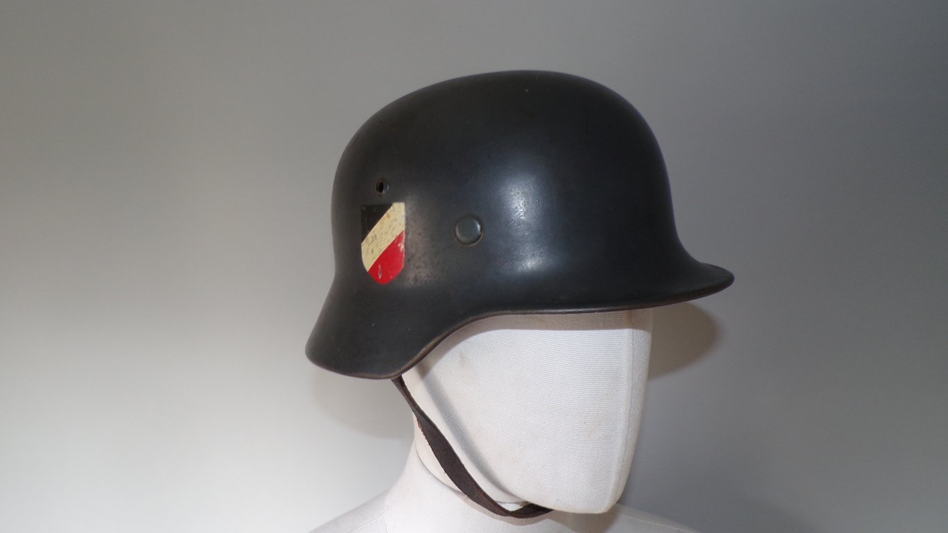 The German M35 helmet (Model 1935 Stahlhelm) was the standard combat helmet of the Wehrmacht at the start of World War II. The design was a modernization of the helmets of the First World War, with a lighter, more compact shape and an improved liner for greater comfort and protection. The M35 distinguishes itself from later models through its high-quality workmanship and specific construction. The underside of the helmet's shell is folded (rolled) inward to create a smooth, rigid brim. Unlike later models, the vents on the M35 are individual hollow rivets pressed into the shell. The shell was made of molybdenum steel plates, which provided an optimal balance between weight and strength. Decals (emblems): Early examples often had two decals: the national tricolor (red, white, and black) on the right and the emblem of the military unit on the left (such as the eagle for the Heer or Luftwaffe). Evolution and Modifications. Although the M35 was used until the end of the war, production was adjusted in 1940 to save costs.