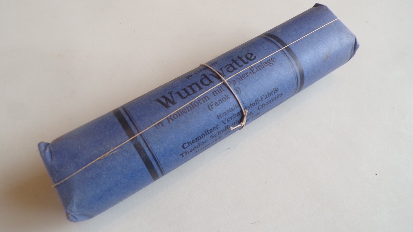 This is not an item that comes along every day. In unused, mint condition. Neatly dated 1938 and manufactured by the Chemnitzer Verbandstoff-Fabrik. The length is 17.5 cm with a diameter of 4 cm. I have several, so if you would like to order more, please contact me.**
