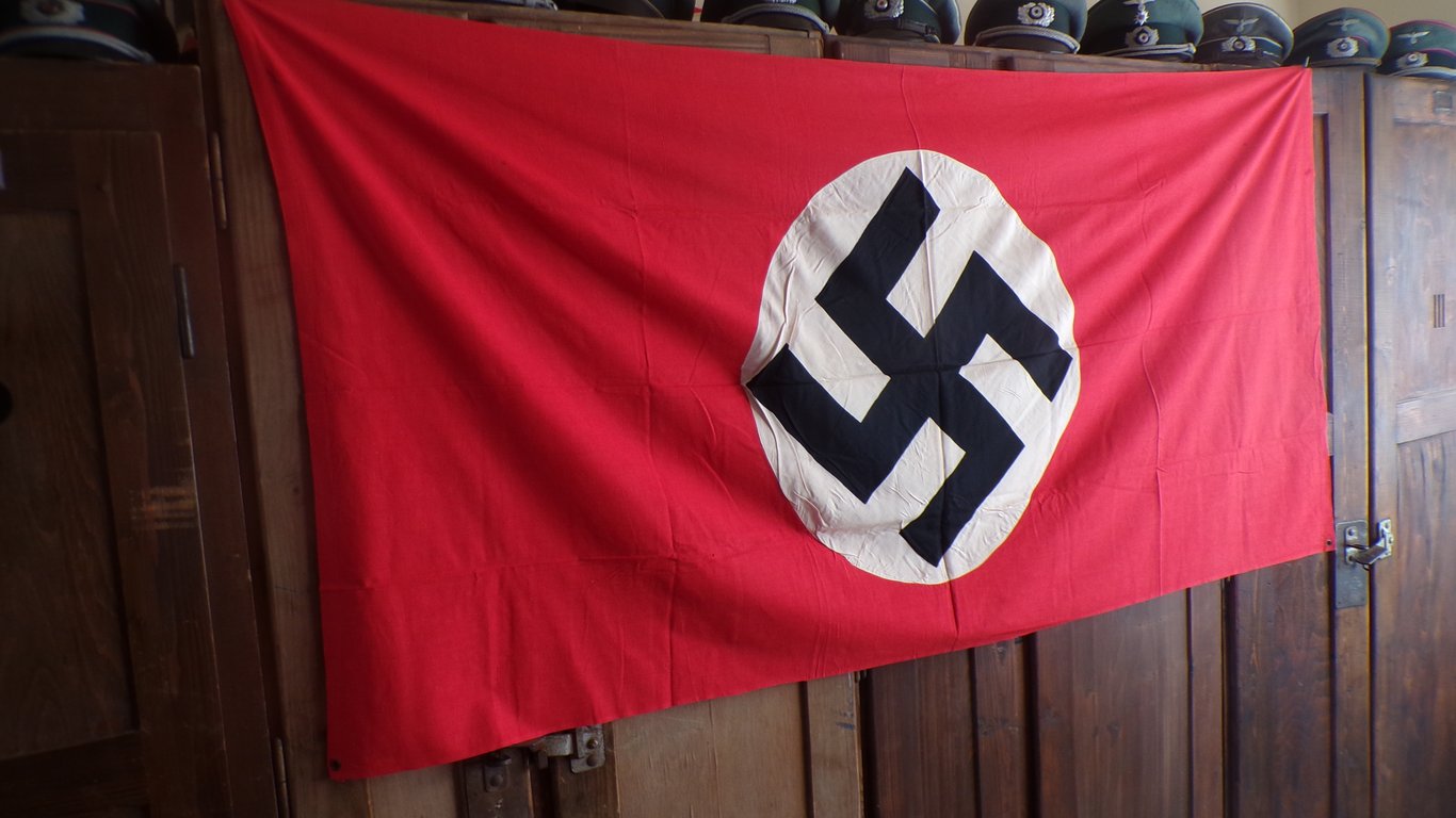 a German vehicle identification flag (Fahrzeug-Erkennungsflagge) a specially designed cloth that was attached flat to the hood, roof or aft deck of a vehicle to help friendly aircraft (such as the Luftwaffe) recognize friendly troops and prevent 'friendly fire'. Unlike normal flags, these ones had metal eyes (Grommets) in all four corners to be able to tie them tightly to a vehicle or tank. The most common version was a red cloth with a white circle and a black swastika (swastika). From April 1941 onwards, a version with the Balkenkreuz (the German Balkenkruis), although the swastika versions remained in use throughout the war. They varied in size, but common sizes were around 90 x 190 cm or 70 x 100 cm, depending on the type of vehicle. Because they were laid flat on a surface, these flags were almost always printed or stitched on one side. During the rapid advance (Blitzkrieg) in Poland and France, they were frequently used because Germany still had air superiority at the time. As the Allies dominated the skies, the flags were used less. A bright red flag on a tank also made the vehicle an easy target for enemy fighter-bombers.