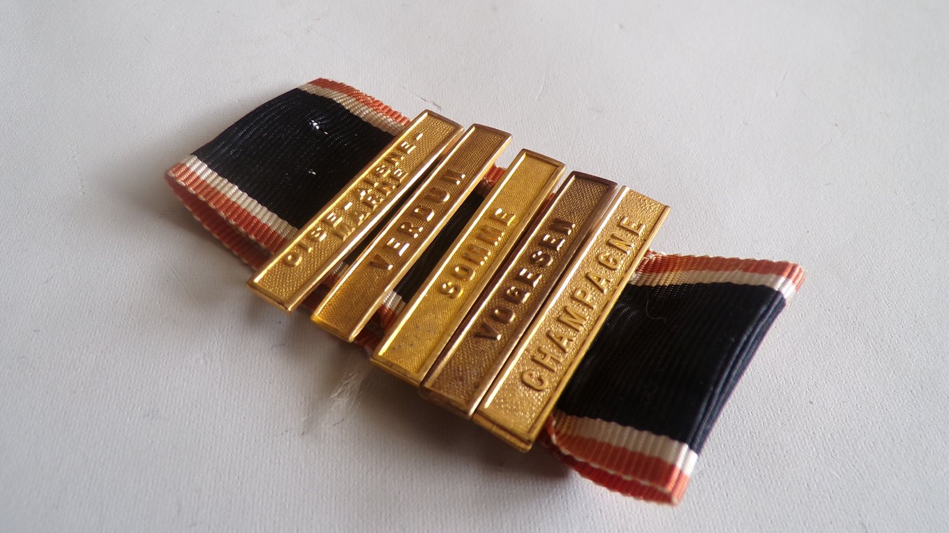 Attached to a long ribbon of the Kyffhäuserbund medal are 5 combat clasps, named: Oise - Aisne - Marne, Verdun, Somme, Vosges, and Champagne. All are in excellent, unused condition.
