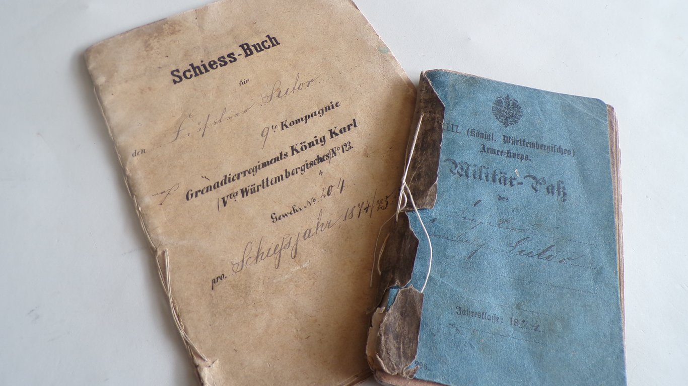 A soldbuch and a shooting book issued in 1874, both fully completed. What strikes me is that the shooting series of the person concerned were fully administered and filled out by the instructor from marksman 3rd class to marksman 2nd class, and that the last series was shot at 600 meters; even in our modern times, this is quite far. Both documents belong to the same person, and this is the father of the S.A. man (Lutor) from the grouping listed below; all these documents come from the same family.