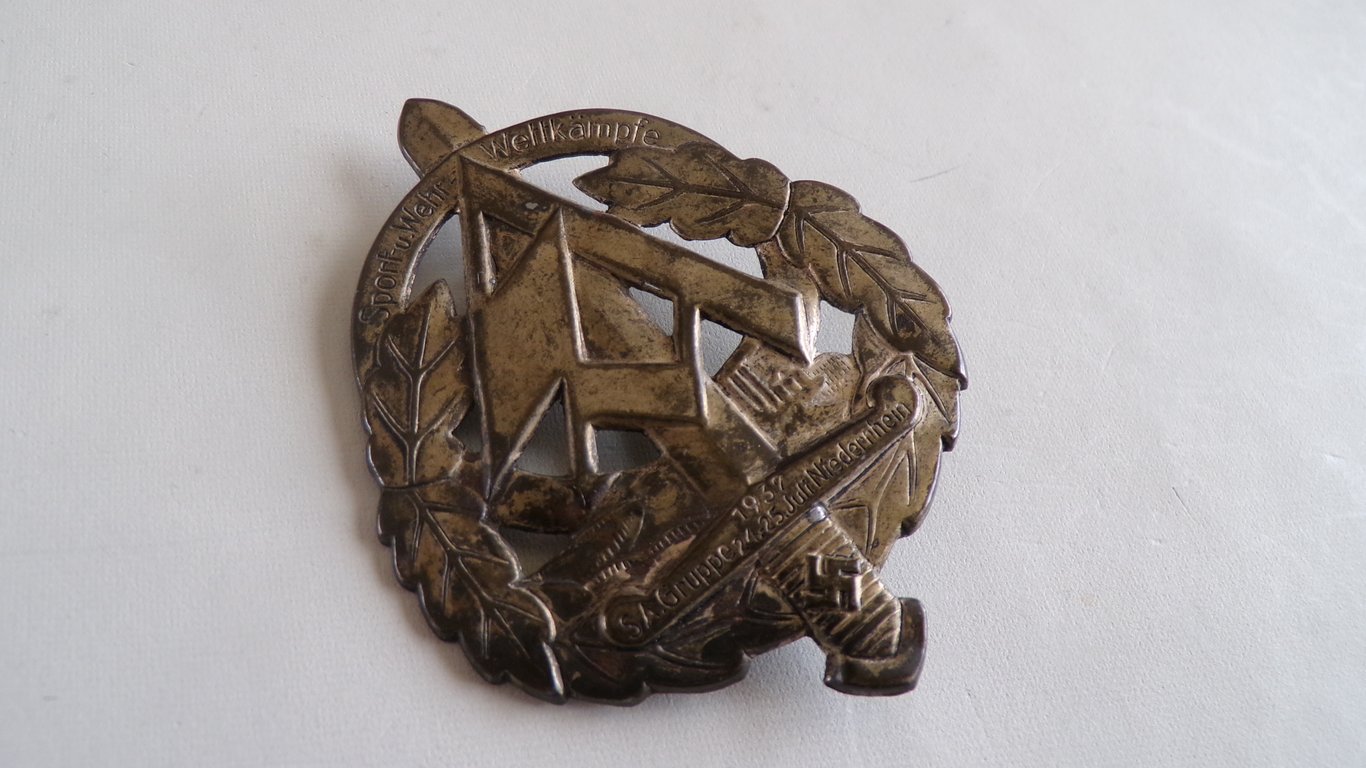 Held by the S.A Gruppe on the 24th and 25th of Juli 1937 in Niederrhein. Good worn condition with the original needle on the back.