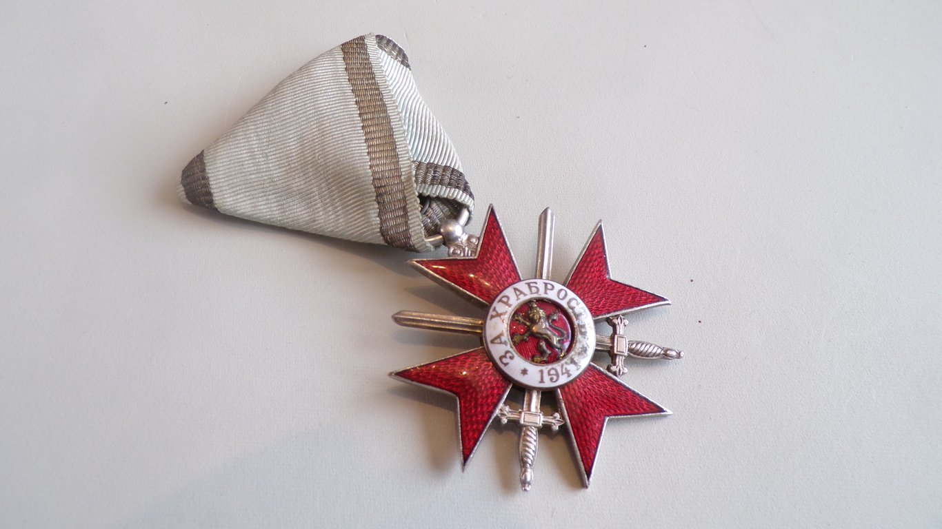 The Bulgarian Military Order "for Bravery" (Bulgarian: Order "For Bravery") IVth class 2nd degree with the year 1941 is a rare officer decoration from the period of the Third Bulgarian Kingdom under Tsar Boris III. Intended for junior officers (such as lieutenants and captains) for exceptional deeds on the battlefield. A silver or silver plated Maltese cross (approx. 39-40 mm) with red enamel arms. Crossed swords between the arms of the cross. Front (Averse): A central red enamel medallion with a golden Bulgarian lion. The white outer ring contains the inscription "FOR BRAVERY 1941" (For Bravery 1941). (Reverse): The crowned monogram of the founder (Prince Alexander I) on red enamel, with the text in the white ring "PRINCE OF BULGARIA 1879". Is worn to a triangular ribbon on the left breast. The ribbon is sky blue with silver stripes along the edges. 1941 Emission: This particular issue marks the year Bulgaria signed the Tripartite Pact. Although awarded to Bulgarian officers, this version was also often granted to officers of the German Wehrmacht. Specimens with the date "1941" are considerably rarer than the earlier "1915" issue from the First World War. Difference with the 1st degree: Where the 2nd degree has a ribbon, the 1st degree of the IVth class is a so-called "stitch-cross" (without ribbon) that is pinned directly on the uniform.