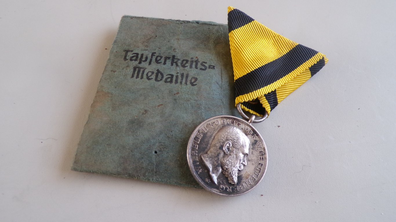 The Military Merit Medal (Militärverdienstmedaille) was the primary bravery award for enlisted personnel and non-commissioned officers from the Kingdom of Württemberg. Instituted by King Wilhelm II, it was awarded for exceptional courage and distinguished service on the battlefield. During the First World War, this silver medal became the Württemberg equivalent of the Prussian Iron Cross, representing the bravery and unwavering loyalty of the Swabian soldiers.