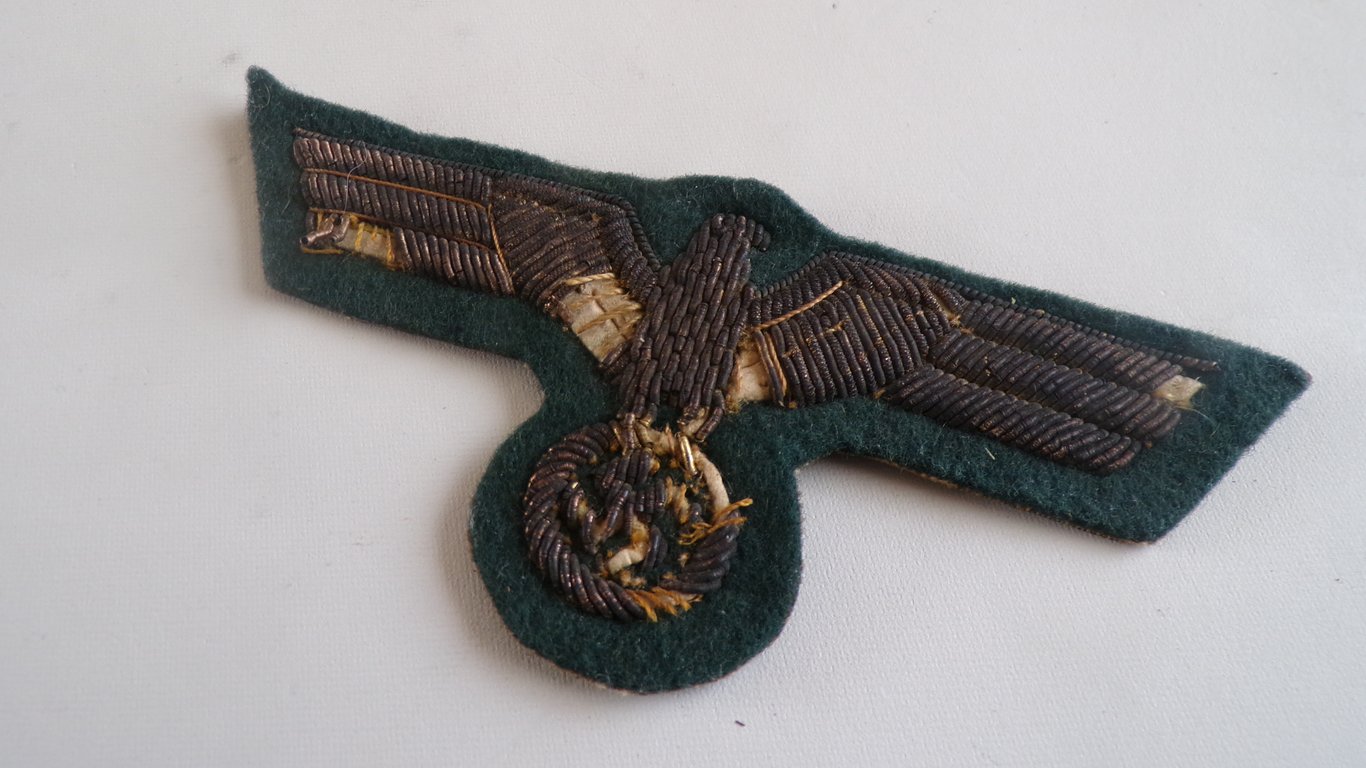 A powerful and 100% original Heer General’s Breast Eagle. This is a textbook example of high-level hand-embroidery on dark bottle-green wool, showing heavy character and a deep, honest age patina. Hand-woven gold bullion thread on a dark-green wool base. The reverse features the correct grey paper backing, typical for high-end period insignia. This eagle has "been there." It shows significant wear, with approximately 85% of the gold bullion intact. There is some loss of wire around the body and the lower left wing, revealing the white structural padding underneath. This type of wear is often seen on tunics that were worn extensively in the field. The gold wire has toned beautifully over the last 80 years, losing its bright shine and taking on a prestigious, muted gold/bronze hue. Sourced from an old US-based estate, this eagle is a perfect "combat-look" piece for a collector who values an item with a real history over a mint-condition replica. An affordable opportunity to own an original General's insignia with a fantastic "salty" appearance.